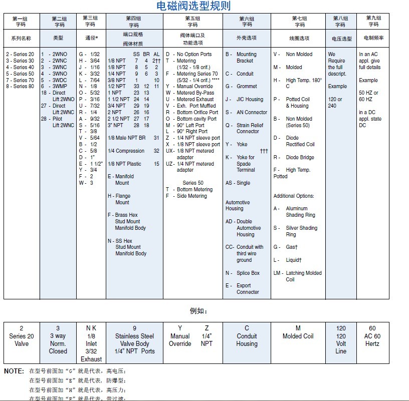 阀体材质: 不锈钢(标配),可选配:黄铜 内部材质: 不锈钢 密封材质: 丁晴橡胶 (Buna) (标配). 可选:FKM、PTFE、EPDM、FFKM等.* 通径规格: 见上列表. 接口规格: 标准1/8″ 和 1/4″ NPT (可选配).* 外壳类型: 引线型, 1/2” NPT管道引线和其他选配.* 安全认证: 经过 UL 和 CSA防爆安全认证.* 使用寿命: 大于500万次,取决于应用程序、维护保养等因素. 阀体重量: 扣环引线: 115 g. 维修包: 见上列表. 选配说明: 可选配的项包括:压力、介质、电压、接口规格、材质、温度、防爆等*.